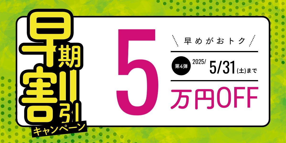 ※第2弾 2/1(日)~2/28(土) 7万円OFF、第3弾 3/1(日)~3/31(火) 6万円OFF、第4弾 4/1(水)~5/31(日) 5万円OFF。