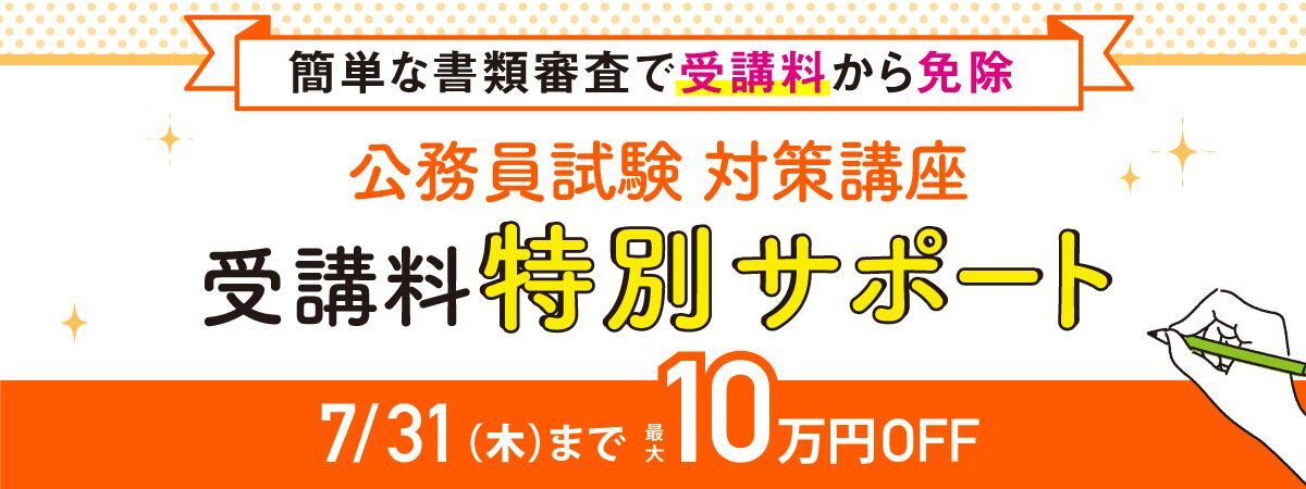 公務員試験キャンペーン 受講料サポート制度 公務員になりたいと思ったきっかけや将来の夢について、あなたのお考えをお聞かせください!あなたの目標達成に向けて、対象講座の受講料の一部を伊藤塾がサポートします。<最大8万円OFF> 詳しく見る 転職応援キャンペーン 働きながら公務員を目指す方を応援します。対象の講座が20%OFF! 詳しく見る 公務員試験対策 他校再受講割引制度 他の受験指導校や大学内で実施される有料の公務員試験講座を受講されてきた方が、伊藤塾の対象講座をご受講の場合に受講料を割引させていただく制度です。 詳しく見る 「司法試験」から「公務員試験」へ 司法試験入門講座受講生の公務員試験への進路変更はよくあること。公務員試験に照準を絞った講座で合格・内定を目指したい方へ、特別割引をご用意しています。 詳しく見る 試験科共通 再受講割引制度 「伊藤塾でもう一度学習し直し、合格を目指したい!」 過去に伊藤塾で講座を受講されたことのある方は、一般受講料から割引いたします。<最大40%OFF> 詳しく見る 友人紹介~Amazonギフト券プレゼント~ ご友人を紹介していただくと、「紹介者」「申込者」それぞれに最大1万円分(期間限定)のAmazonギフト券をプレゼント!まだ塾生でない方同士でのお申し込みの場合にもご利用可能です。 詳しく見る