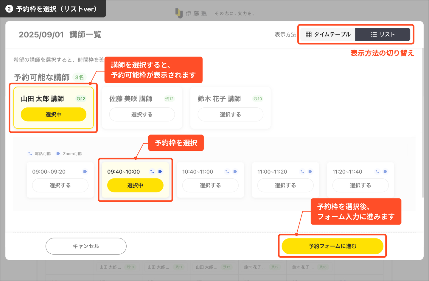 複数の方が同じタイミングで同じ予約枠を選んだ場合、先に予約完了画面まで進んだ方の予約枠が確定します