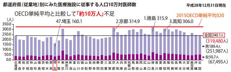 東京医大の不正入試が「女性差別」等の観点から大きな社会問題となっていますが、日本は1983年に厚生省官僚が提唱した「医療費亡国論」を契機に、医療費抑制のために医学部定員を削減し、医師数だけでなく医療費も先進国最低レベルとなっています。しかし日本の人口当り医師数が先進国最少で、日本で一番医師数が多い徳島県もOECD加盟国平均より少ないという事実が報道されることはありません。