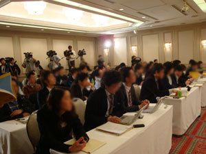 当日夕方4時から、弁護士有志の方々による一般メディア向けの記者会見が行われました。この様子は「ニコニコ動画」さんで生中継されました。その他にキー局の報道カメラが5台。報道記者や一般の方で、用意されていた60席はすぐに満席となり、通路にも椅子を並べ、立ち見も出るほどでした。参加された皆さんは、各地から来られた弁護士による説明・訴えを、熱心にメモをとりながら聴いていらっしゃいました。