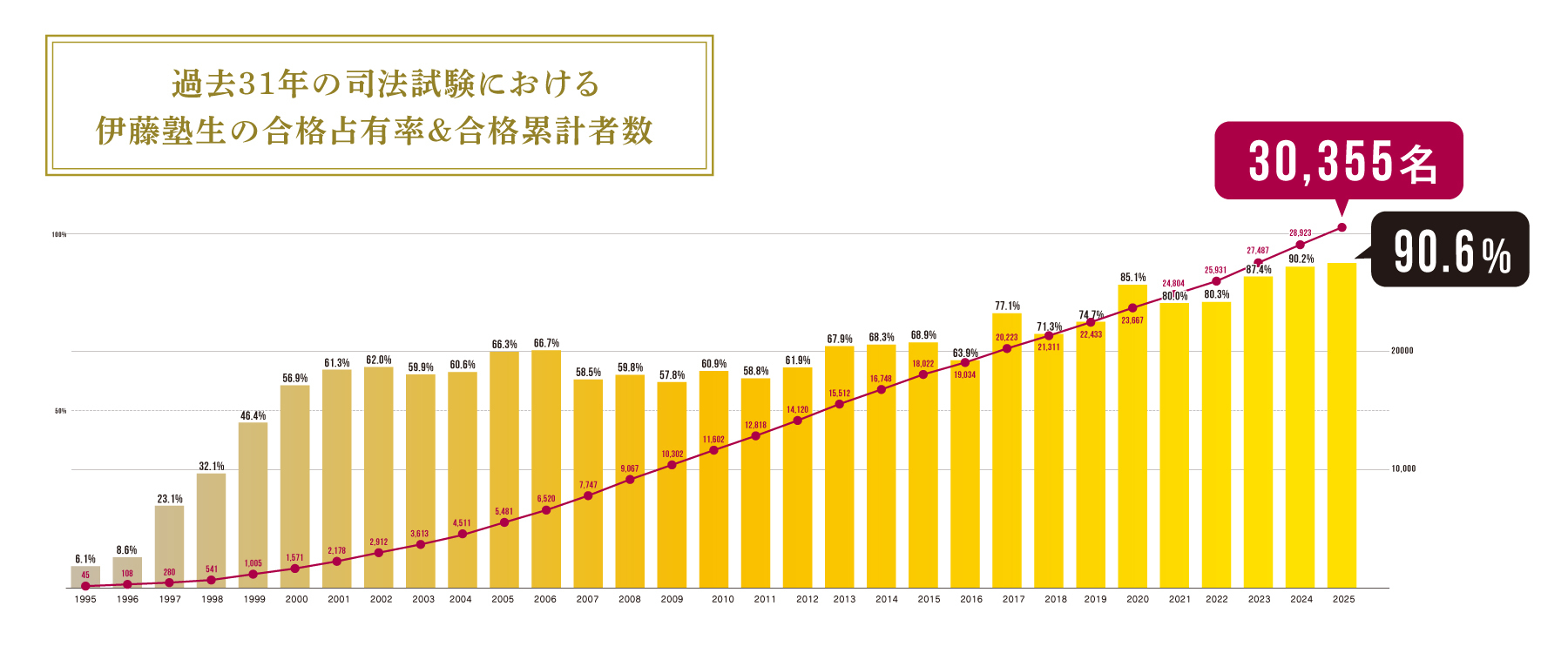 (1995年~2005年は旧司法試験、2006年~2011年は旧司法試験と新司法試験、2012年~2025年は新司法試験の合格者より算出。いずれも伊藤塾調べ、2025年11月21日時点)