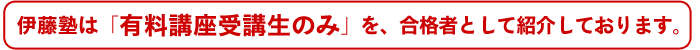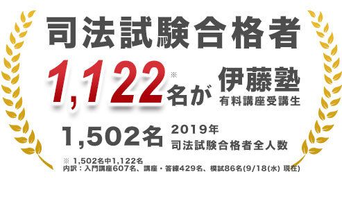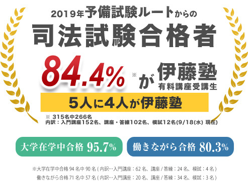 1995年:合格者738名中45名が伊藤塾有料受講生<講座内訳:入門講座23名、講座/答練22名>、1996年:合格者734中63名が伊藤塾有料受講生<講座内訳:入門講座24名、講座/答練37名、模試2名>、1997年:合格者746中172名が伊藤塾有料受講生<講座内訳:入門講座21名、講座/答練150名、模試1名>、1998年:合格者812中261名が伊藤塾有料受講生<講座内訳:入門講座42名、講座/答練216名、模試3名>、1999年:合格者1,000中464名が伊藤塾有料受講生<講座内訳:入門講座91名、講座/答練358名、模試15名>、2000年:合格者994中566名が伊藤塾有料受講生<講座内訳:入門講座151名、講座/答練404名、模試11名>、2001年:合格者990中607名が伊藤塾有料受講生<講座内訳:入門講座155名、講座/答練432名、模試20名>、2002年:合格者1,183中734名が伊藤塾有料受講生<講座内訳:入門講座222名、講座/答練483名、模試29名>、 2003年:合格者1,170中701名が伊藤塾有料受講生<講座内訳:入門講座237名、講座/答練433名、模試31名>、2004年:合格者1,483中898名が伊藤塾有料受講生<講座内訳:入門講座284名、講座/答練567名、模試47名>、2005年:合格者1,464中970名が伊藤塾有料受講生<講座内訳:入門講座365名、講座/答練561名、模試44名>、2006年:合格者1,558中1,039名が伊藤塾有料受講生<講座内訳:入門講座386名、講座/答練585名、模試68名>、2007年:合格者2,099中1,227名が伊藤塾有料受講生<講座内訳:入門講座462名、講座/答練668名、模試97名>、2008年:合格者2,209中1,320名が伊藤塾有料受講生<講座内訳:入門講座534名、講座/答練695名、模試91名>、2009年:合格者2,135中1,232名が伊藤塾有料受講生<講座内訳:入門講座555名、講座/答練534名、模試143名>、2010年:合格者2,133中1,300名が伊藤塾有料受講生<講座内訳:入門講座642名、講座/答練536名、模試122名>、2011年:合格者2,069中1,216名が伊藤塾有料受講生<講座内訳:入門講座531名、講座/答練584名、模試101名>、 2012年:合格者2,102中1,302名が伊藤塾有料受講生<講座内訳:入門講座635名、講座/答練574名、模試93名>、2013年:合格者2,049中1,392名が伊藤塾有料受講生<講座内訳:入門講座759名、講座/答練539名、模試94名>、2014年:合格者1,810中1,236名が伊藤塾有料受講生<講座内訳:入門講座740名、講座/答練420名、模試76名>、2015年:合格者1,850中1,274名が伊藤塾有料受講生<講座内訳:入門講座733名、講座/答練469名、模試72名>、2016年:合格者1,583中1,009名が伊藤塾有料受講生<講座内訳:入門講座577名、講座/答練370名、模試62名>、2017年:合格者1,543中1,189名が伊藤塾有料受講生<講座内訳:入門講座706名、講座/答練378名、模試105名>、2018年:合格者1,525中1,088名が伊藤塾有料受講生<講座内訳:入門講座667名、講座/答練368名、模試53名>、2019年:合格者1,502中1,122名が伊藤塾有料受講生<講座内訳:入門講座607名、講座/答練429名、模試86名>、2020年:合格者1,450中1,234名が伊藤塾有料受講生<講座内訳:入門講座673名、講座/答練403名、模試158名>、2021年:合格者1,421中1,137名が伊藤塾有料受講生<講座内訳:入門講座613名、講座/答練384名、模試140名>、2022年:合格者1,403中1,130名が伊藤塾有料受講生<講座内訳:入門講座580名、講座/答練397名、模試153名>、2023年:合格者1,781中1,547名が伊藤塾有料受講生<講座内訳:入門講座745名、講座/答練404名、模試398名>、2024年:合格者1,592中1,436名が伊藤塾有料受講生<講座内訳:入門講座698名、講座/答練337名、模試401名>、2025年:合格者1,581中1,432名が伊藤塾有料受講生<講座内訳:入門講座640名、講座/答練321名、模試471名>