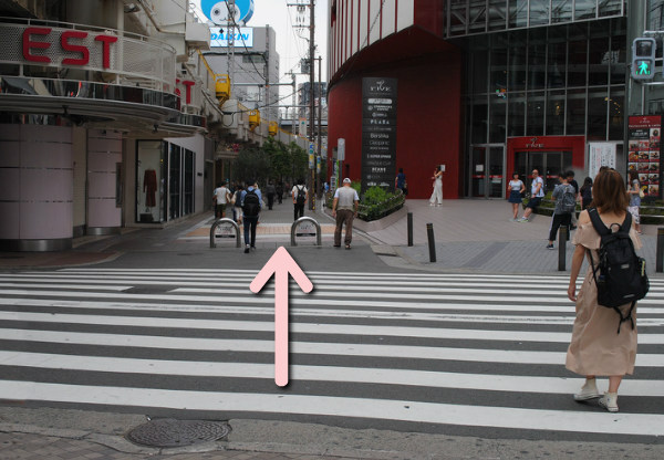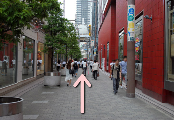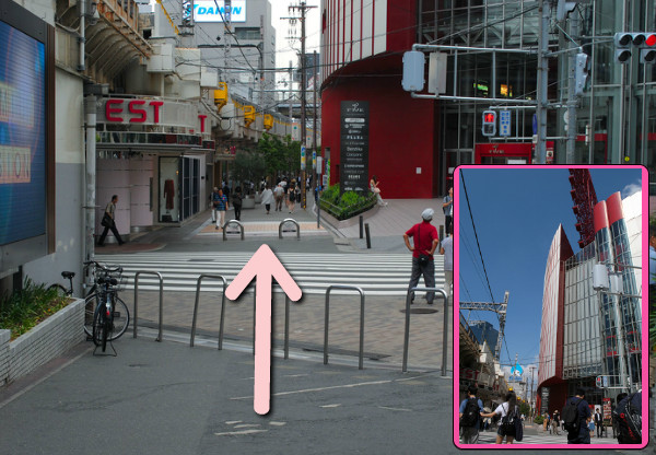 信号を渡って、ESTとHEP FIVEの間の道(=エスト通りという歩行者専用道)を進んでください。