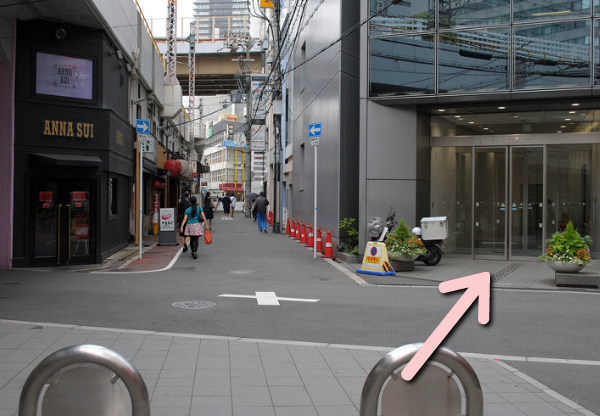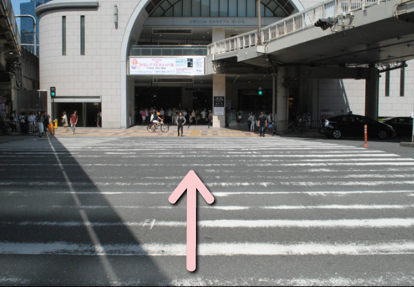 エスト通りが途切れるところ、交差点の向かい側右手のビルが「阪急ファイブアネックス」。