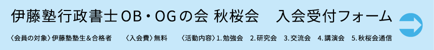 | 19/4/18(木)【メール受信設定のお願い】 秋桜会では、会員限定特別受講料や限定イベント、懇親会など会員様にオトクなご案内を「秋桜会通信」というメールにて主に行っています。マイページ新規会員登録時、「メールマガジン」欄にて「希望しない」にチェックを入れた 場合、「秋桜会通信」は届きません。「希望しない」にチェックを入れている方は、マイページ「プロフィール編集画面」より「メールマガジンを希望する」(行政書士試験)に チェックを入れていただけますようお願いいたします。 |
