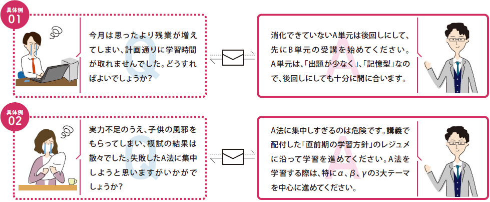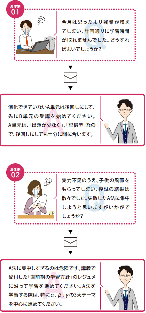 速修生では、合格に必要な知識の提供はもちろんのこと、具体的な学習方法のアドバイス、お一人おひとりの学習状況や弱点をヒアリングしたうえでの個別学習アドバイス、プランの提案等をおこない、合格までしっかりとサポートしていきます。