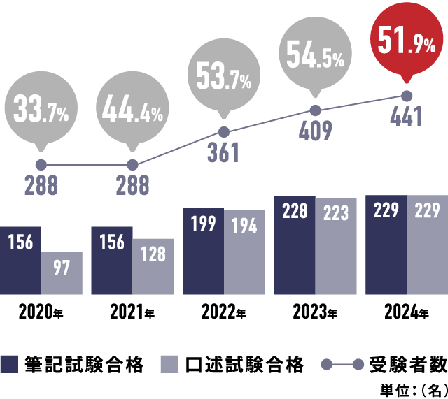 口述試験4科目の総得点40点の60%以上の得点をあげた者。