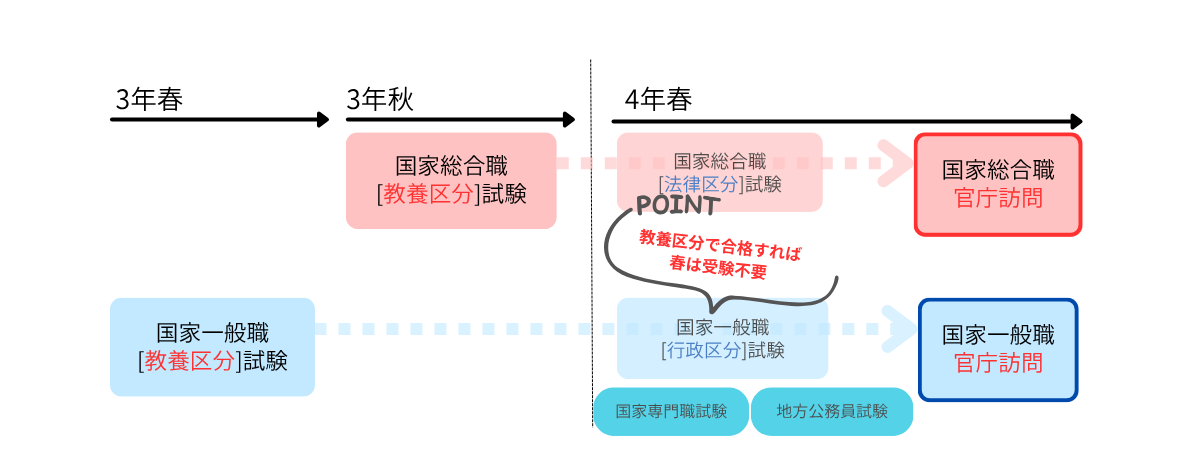 一般職が本命の方は官庁訪問に向けた準備などに使える時間的余裕ができるのはもちろんのこと、総合職との併願で受験される方にも、一般職教養区分の受験はおすすめです。総合職対策をしていれば十分に対応が可能ですし、一般職試験に3年次に合格してしまえば、これから総合職試験や官庁訪問、民間の選考などに使える時間を確保することができます。