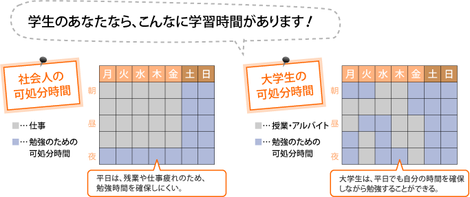 大学生という立場は、資格取得のための最適の環境といえます。その理由として、働きながら合格を目指す社会人に比べて可処分時間が多く、学習時間の融通をつけやすい点、また、周囲に同じ目標を持った仲間をつくりやすいという点が挙げられます。実際、これらの環境を活かした先輩たちは、在学中に、卒業後すぐに短期合格を果たしています。
