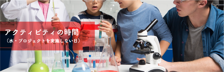 毎週水曜日と長期休み期間中、探究型学習(プロジェクト学習)がない日は、アクティビティと呼んでいる製作や実験、体験などの活動を行います。様々な活動から物事への興味関心、子どもたちの「なぜ?」を引き出していきます。