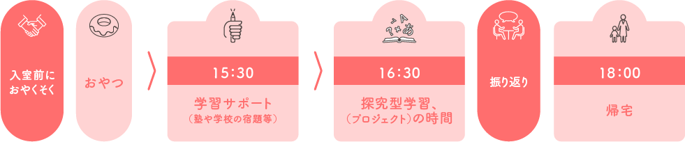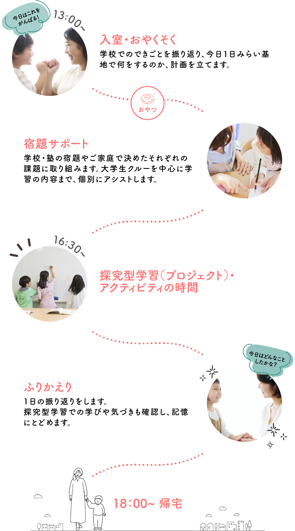 お子様ごとに異なる日々の活動報告、一人ひとりの興味・関心を引き出す探究型学習やアクティビティ、宿題や自己学習の見守りなど、きめ細やかなサポートで安心してお預けいただけます。