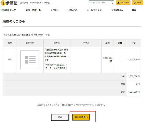 「現在のカゴの中」としてご選択中のカートの中身が表示されます。(この時点では一般受講料で表示されます。割引適用するクーポンは後に設定いただきます。)