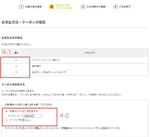 「お支払方法の指定」欄で、ご希望の支払方法を選択(4-1)してください。