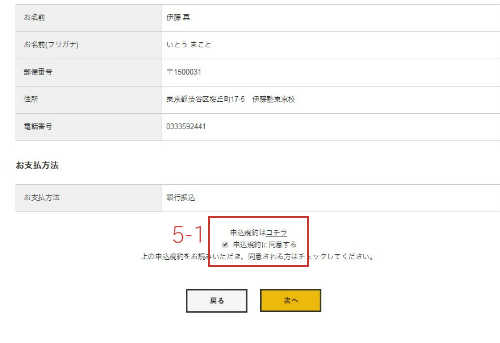 内容をご確認いただき、問題なければ、申込規約をご確認の上、「申込規約に同意する」にチェック(5-1)をして、「次へ」をクリックしてください。