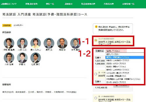 申し込みを希望する講座のラジオボタン(1-1/○部分)を選択し、次に希望する受講形態を選択(1-2)してください。