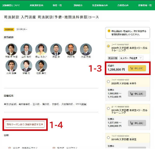 受講形態を選択いただだくと、講座の金額が表示され「申し込む(グレー)」が「申し込む(黄色)」(1-3)に変わります。