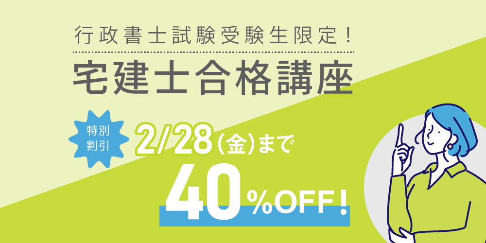 2024年度行政書士試験を受験された方が、「2025年合格目標 宅建士試験対策講座」を申し込みされる際にご利用いただける割引キャンペーンです。