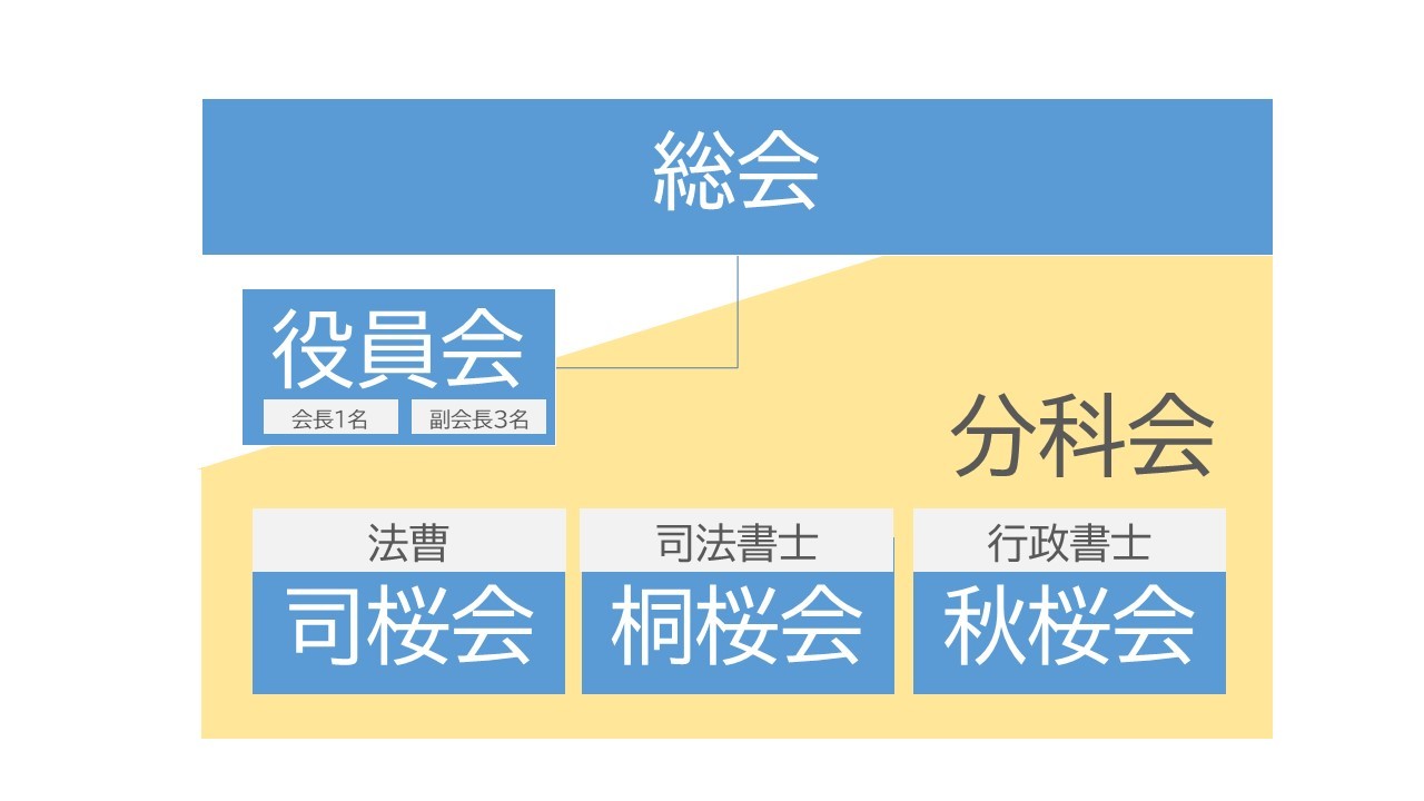 これとは別にそれぞれの業種において分科会を3つ設け、法曹を「司桜会」(しおうかい)、司法書士を「桐桜会」(とうおうかい)、行政書士を「秋桜会」(こすもすかい)という名称としています。