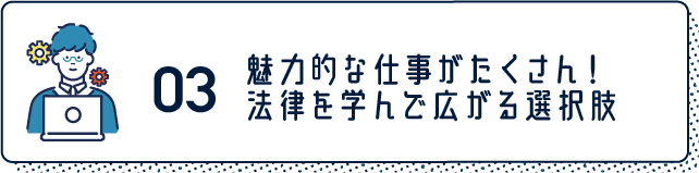 実は法律学で身に付くこの「問題解決力」は、あらゆるビジネスパーソンに必要とされる必須スキル。法律を通じこの社会人基礎力を自然と身に付けることができるのです。