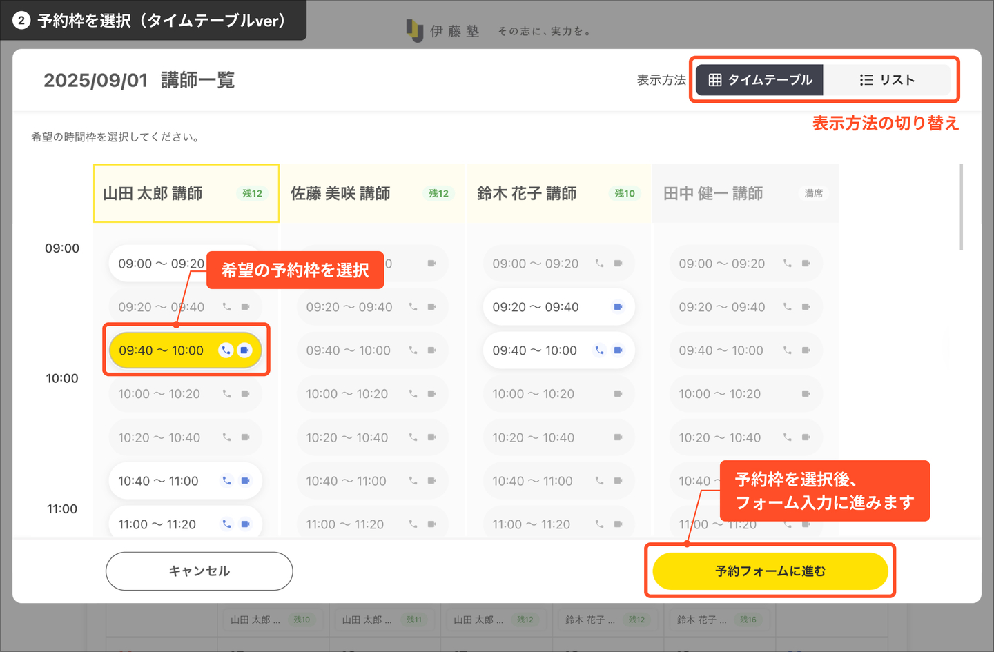 複数の方が同じタイミングで同じ予約枠を選んだ場合、先に予約完了画面まで進んだ方の予約枠が確定します