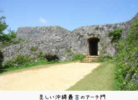 特徴的な美しいアーチの城壁と門は必見。城跡の高台から西側を望むと残波岬や慶良間諸島も眺めることができます。琉球王国のグスク及び関連遺産群としてユネスコの世界遺産にも登録されています。