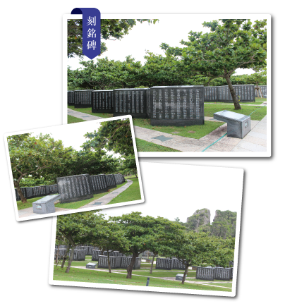 刻銘碑は、平和の広場を中心にして放射状に円弧の形で広がりをもつ5つ折タイプ69基、3つ折タイプ49基の合わせて118基、刻銘版は、1,220面に及び、約25万名の刻銘が可能。戦没者の追悼と平和祈念・戦争体験の教訓の継承・安らぎと学びの場の3つを基本理念としている。