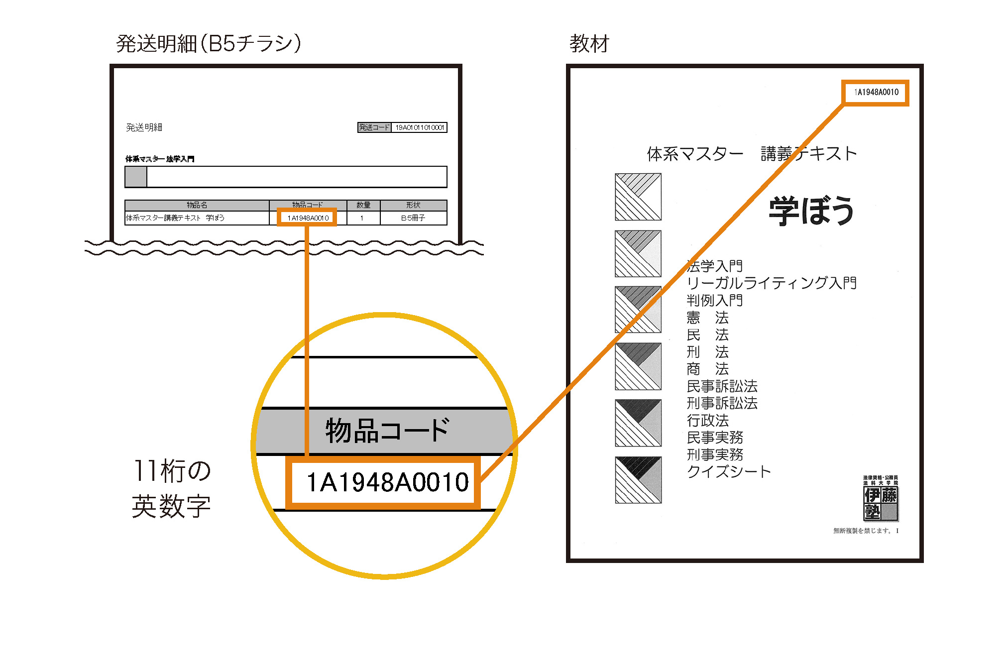 発送明細の「物品コード」が、教材の右上の英数字と同じか確認