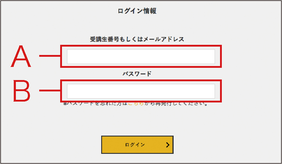 2) 表示されるログインフォームの上段(A)に、受講生番号もしくはメールアドレス、下段(B)にパスワードを入力して〔ログイン〕。