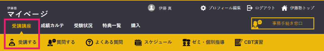 1) 伊藤塾Webサイトを開いて、右上にある マイページをクリック。