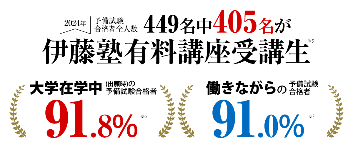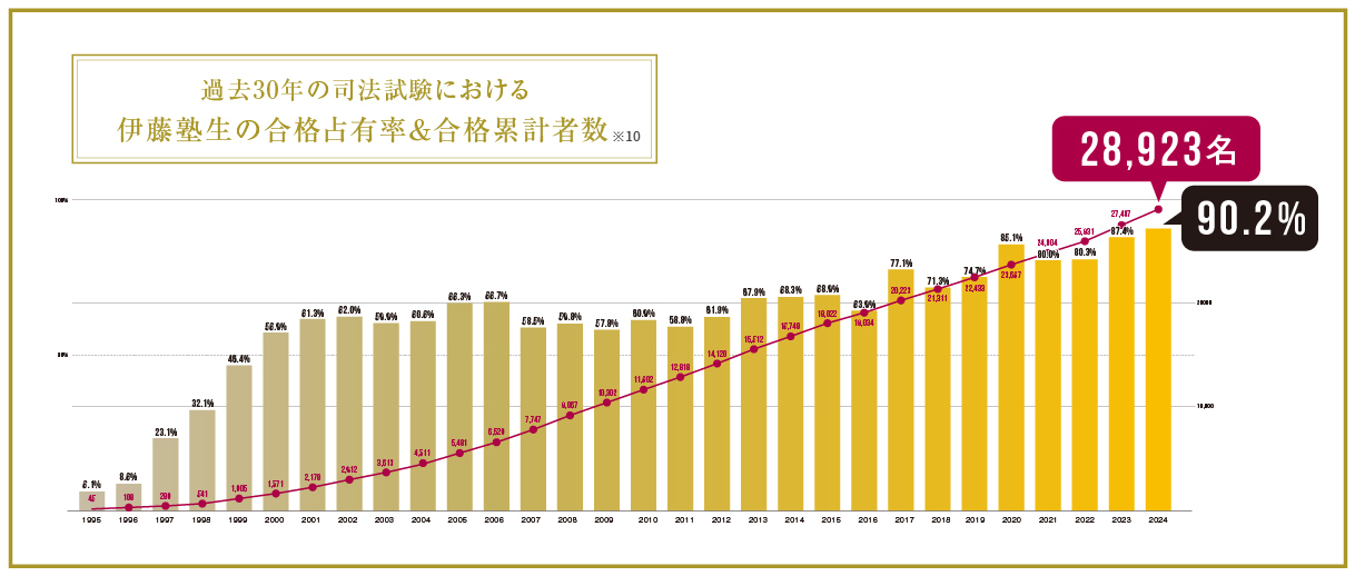 1995年:合格者738名中45名が伊藤塾有料受講生<講座内訳:入門講座23名、講座/答練22名>、1996年:合格者734中63名が伊藤塾有料受講生<講座内訳:入門講座24名、講座/答練37名、模試2名>、1997年:合格者746中172名が伊藤塾有料受講生<講座内訳:入門講座21名、講座/答練150名、模試1名>、1998年:合格者812中261名が伊藤塾有料受講生<講座内訳:入門講座42名、講座/答練216名、模試3名>、1999年:合格者1,000中464名が伊藤塾有料受講生<講座内訳:入門講座91名、講座/答練358名、模試15名>、2000年:合格者994中566名が伊藤塾有料受講生<講座内訳:入門講座151名、講座/答練404名、模試11名>、2001年:合格者990中607名が伊藤塾有料受講生<講座内訳:入門講座155名、講座/答練432名、模試20名>、2002年:合格者1,183中734名が伊藤塾有料受講生<講座内訳:入門講座222名、講座/答練483名、模試29名>、 2003年:合格者1,170中701名が伊藤塾有料受講生<講座内訳:入門講座237名、講座/答練433名、模試31名>、2004年:合格者1,483中898名が伊藤塾有料受講生<講座内訳:入門講座284名、講座/答練567名、模試47名>、2005年:合格者1,464中970名が伊藤塾有料受講生<講座内訳:入門講座365名、講座/答練561名、模試44名>、2006年:合格者1,558中1,039名が伊藤塾有料受講生<講座内訳:入門講座386名、講座/答練585名、模試68名>、2007年:合格者2,099中1,227名が伊藤塾有料受講生<講座内訳:入門講座462名、講座/答練668名、模試97名>、2008年:合格者2,209中1,320名が伊藤塾有料受講生<講座内訳:入門講座534名、講座/答練695名、模試91名>、2009年:合格者2,135中1,232名が伊藤塾有料受講生<講座内訳:入門講座555名、講座/答練534名、模試143名>、2010年:合格者2,133中1,300名が伊藤塾有料受講生<講座内訳:入門講座642名、講座/答練536名、模試122名>、2011年:合格者2,069中1,216名が伊藤塾有料受講生<講座内訳:入門講座531名、講座/答練584名、模試101名>、 2012年:合格者2,102中1,302名が伊藤塾有料受講生<講座内訳:入門講座635名、講座/答練574名、模試93名>、2013年:合格者2,049中1,392名が伊藤塾有料受講生<講座内訳:入門講座759名、講座/答練539名、模試94名>、2014年:合格者1,810中1,236名が伊藤塾有料受講生<講座内訳:入門講座740名、講座/答練420名、模試76名>、2015年:合格者1,850中1,274名が伊藤塾有料受講生<講座内訳:入門講座733名、講座/答練469名、模試72名>、2016年:合格者1,583中1,009名が伊藤塾有料受講生<講座内訳:入門講座577名、講座/答練370名、模試62名>、2017年:合格者1,543中1,189名が伊藤塾有料受講生<講座内訳:入門講座706名、講座/答練378名、模試105名>、2018年:合格者1,525中1,088名が伊藤塾有料受講生<講座内訳:入門講座667名、講座/答練368名、模試53名>、2019年:合格者1,502中1,122名が伊藤塾有料受講生<講座内訳:入門講座607名、講座/答練429名、模試86名>、2020年:合格者1,450中1,234名が伊藤塾有料受講生<講座内訳:入門講座673名、講座/答練403名、模試158名>、2021年:合格者1,421中1,137名が伊藤塾有料受講生<講座内訳:入門講座613名、講座/答練384名、模試140名>、2022年:合格者1,403中1,130名が伊藤塾有料受講生<講座内訳:入門講座580名、講座/答練397名、模試153名>、2023年:合格者1,781中1,547名が伊藤塾有料受講生<講座内訳:入門講座745名、講座/答練404名、模試398名>、2024年:合格者1,592中1,436名が伊藤塾有料受講生<講座内訳:入門講座698名、講座/答練337名、模試401名>、2025年:合格者1,581中1,432名が伊藤塾有料受講生<講座内訳:入門講座640名、講座/答練321名、模試471名>