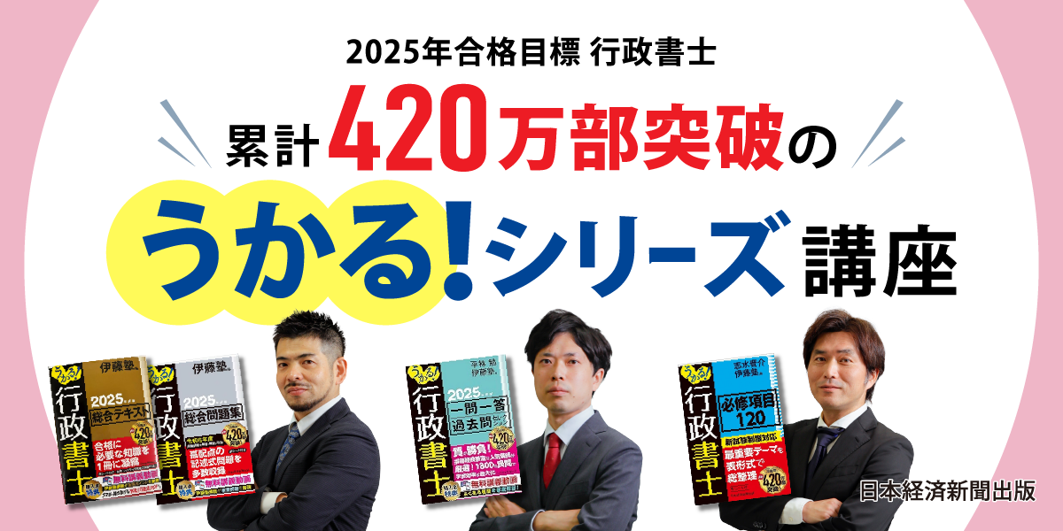 書籍『うかる!行政書士総合テキスト』と『うかる!総合問題集』(ともに2026年度版)を教材として使用する講座です。