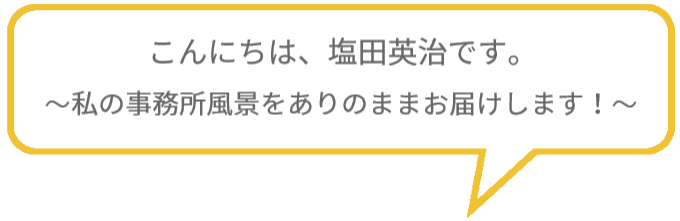 このコーナーは、行政書士 塩田英治先生が、ご自身の事務所の様子から、実際の普段の行政書士実務の様子、はたまた行政書士ライフまでをお伝えするコーナーです。