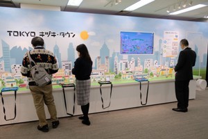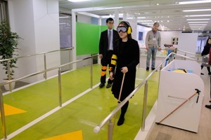 次に展示室に移動しました。ここでは、車椅子バスケット用の車椅子に乗ったり、当事者の方々の「生の声」をモニターで視聴したり、高齢者、障害者、妊婦さんの感じる様々なバリア装具を身につけたり、まちのジオラマにタブレットをかざして人権クイズに答えたり、インターネットのルールやマナーをスマートフォン風のデジタルサイネージで学んだり、色々な形式で人権について学びました。実際に車椅子に乗って動くと坂道がとても怖いと感じる事、アイマスクを装着すると視界がぼやけて歩くことができないことなどを、身をもって体験することこそが、当事者の気持ちを理解することにつながると感じました。