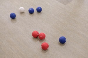 まず、赤・青二つのグループに分かれ、ジャックボール(白)を赤チームの一人が投げます。さらに同じ人が赤ボールを投げます。次に、青ボールチームの誰かが青ボールを投げます。これ以降はジャックボールに遠いほうのチームが投げます。一方のチームの投げるボールがなくなれば、もう一方のチームが連続で投げます。得点は、双方のチームの最もジャックボールに近いボールを比較し、どちらが近いかを判定。陸上版のカーリングのようなものです。ボールを投げる加減が難しく、勢いが強すぎるとかなり距離が離れてしまいますし、逆に弱いとジャックボールまでの距離が遠くなってしまいます。メンバーの中には、初めてとは思えないほどセンスの良い方もいて、ジャックボールの至近距離にボールが止まると、会場内から拍手が起こるなど、大変盛り上がりました。最後に、全員でボールを持って記念写真を撮りました。