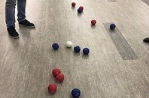 最後に重度脳性麻痺者や四肢機能障害者のために考案されたスポーツのボッチャ(パラリンピックの正式種目)を体験しました。