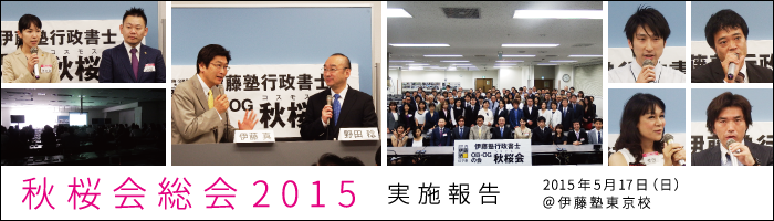 2015年5月17日(日)13時より、伊藤塾東京校におきまして、秋桜会総会2015が行われました。当日は100名ほどの会員の皆様にお越しいただき、秋桜会の理念の確認や、野田稔先生、伊藤真先生の対談を聞くことができました。