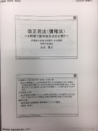 勉強会では、志水先生が独自に作成された「民法新旧対照表」を使って、どの条文がどのように改正されるのか、どんな条文が新設されるのかなどを、一つ一つ丁寧に解説されていました。この「民法新旧対照表」は、今後行政書士として様々な業務を行っていく際にも大いに活用できるものとなっていて、それだけでも十分な価値があるものでした。
