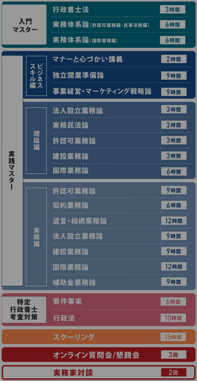 行政書士実務の「王道」と呼ばれる建設業務を中心とする許認可業務はもちろん、近年ニーズの高い国際業務、遺言相続業務など幅広い分野を学習していきます。実務講座で身につけた行政書士実務の確かな「基礎知識」と「柔軟な対応力」をもってすれば、安心して業務対応することができることでしょう。