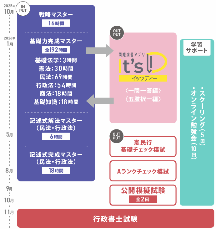 また、行政書士試験の主要科目である「民法」「行政法」については、それぞれの全体像を把握するために必要な「入門講義」を実施し、本格的な講義に入るための準備をします。