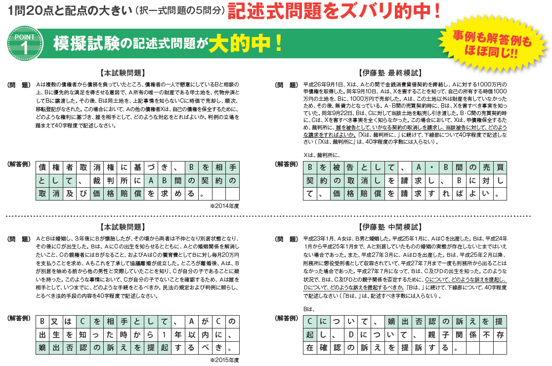 伊藤塾の公開模擬試験は、毎年多くの合格者、受験生の皆さんから高い評価をいただいています。今年度も2019年度本試験に向けた質の高い新作予想問題を出題します。