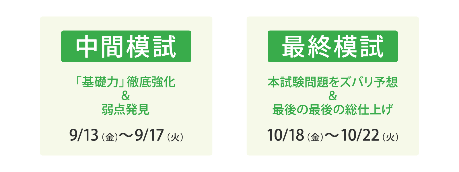 最終模試 10/19(土) T02クラスは定員に達したため、申し込み受付を終了しました。