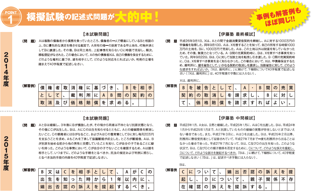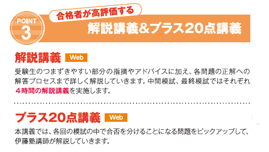 この講座では、講義内で実際の記述式問題を解きながら解説をすることによって、記述式問題の正しい読み方・解き方を伝授します。もちろん、この対策は択ー式にも活きます。