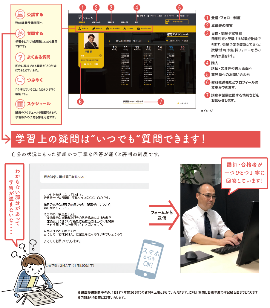 「質問制度」では、講師をはじめとする合格者が、1件1件個別に質問にお答えしますので、わからないところがあってもつまづくことなく勉強を進めることができます。事前予約等なくいつでも質問していただけるので、勉強方法についても悩むことなく学習を継続していくことができます。