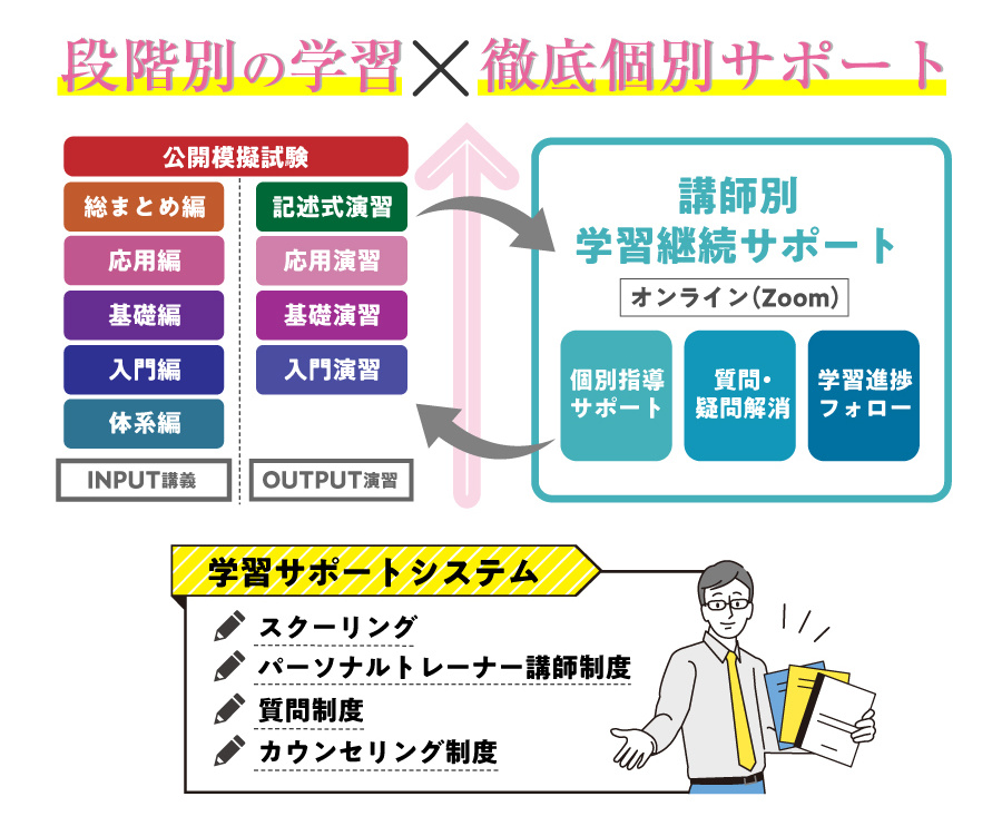 合格に直結するポイントに的を絞り、豊富な具体例を用いてわかりやすく解説。着実に力を積み上げていくことができるカリキュラムと、講師・合格者による徹底サポートで、最後まで安心して学習できます。