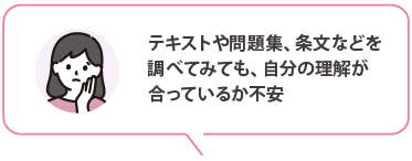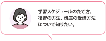 速修生では、合格に必要な知識の提供はもちろんのこと、具体的な学習方法のアドバイス、お一人おひとりの学習状況や弱点をヒアリングしたうえでの個別学習アドバイス、プランの提案等をおこない、合格までしっかりとサポートしていきます。