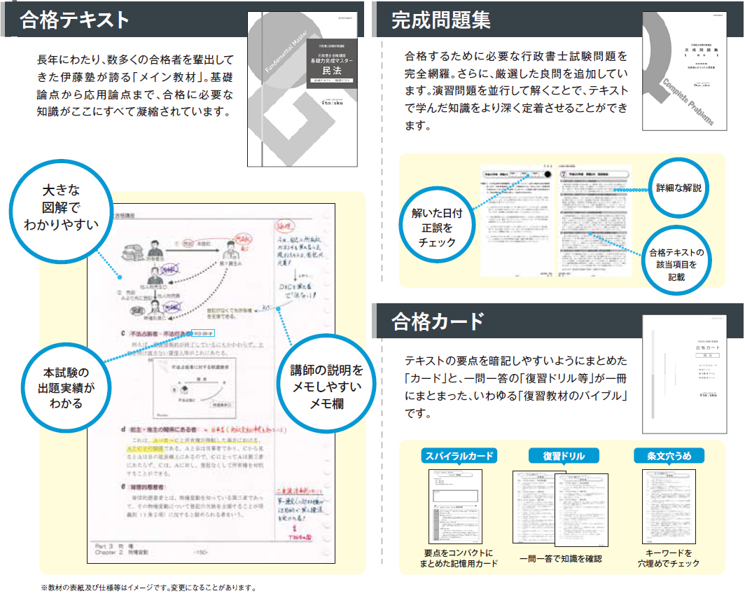 「六法」だけは、ご用意いただきますが、その他の参考書等の教材は一切必要ありません。講義でお渡しする教材だけで十分合格することが可能です。ご安心ください。