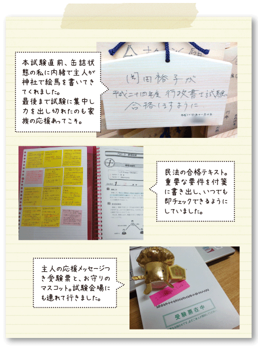 勉強時間を割けない平日は、録音した条文とICレコーダーにダウンロードしたインターネット講義を通勤中に聴き、耳で復習。講義の後はまず講師のブログで重点を確認。必要十分な知識が網羅された合格テキストを学習の中心に据え、講師のアドバイス「基礎を大切に」をしっかり実行できたことが2年目の合格につながったと思います。