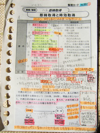 10月以降は、答練、模試の問題演習を中心に、間違えた部分/あいまいな部分はもう一度、カードに戻り、該当・周辺部分を確認していきました。他に記述対策講義を補習し、暗記するぐらい繰り返しました。「特別な記述対策は不要」という方もいますが、60点という配点の高さから必要と思います。また、あいまいな知識の精度が高まり、択一対策にも繋がりました。