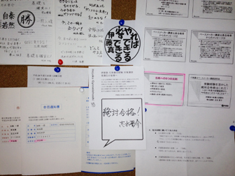 自宅の机の上に「掲示板」を作成し、直前期は講師陣の寄書や講座出身合格者メッセージ、過去の不合格通知を貼り、励みとバネの根性論で乗り切った。